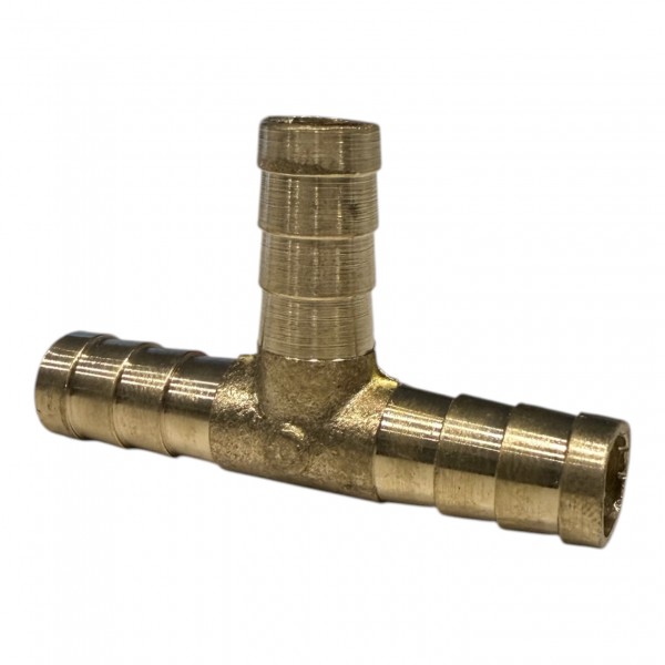 Трійник латунний з'єднувальний з різбленням типу <<ялинка>> для кращої фіксації шланга чи рукава, виготовлений методом лиття та призначений для з'єднання гумових шлангів водопроводу, газопроводу та інших систем в умовах неагресивного середовища.