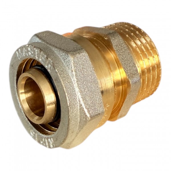 Цангова муфта для металевопластикових труб діаметром 16 мм із зовнішнім різбленням 1/2". Виготовлена з високоякісної латуні, забезпечуючи довговічність та стійкість до корозії.